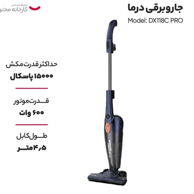 ویژگیهای نظافتی فیلتر قابل شستوشو تعداد چرخ بدون چرخ تعداد سری سه عدد تعداد پارویی یک عدد محدوده میزان صدا 70-75 دسی بل نوع جاروبرقی بدون کیسه توان مکش 15000 پاسکال وات قدرت موتور 600 وات وات میزان صدا 75dB و کمتر دسیبل وزن 1500 گرم ابعاد 1000x250x130 میلیمتر محتویات بسته بندی 1 عدد دفترچه راهنما, 3 عدد سری مختلف, 1 عدد جارو برقی برند:Deerma (زیر مجموعه شیائومی) مدل: DX118C Pro جنس بدنه: پلاستیک ABS مدل طراحی: عصایی ولتاژ ورودی: 220 تا 240 ولت طول کابل: 4.5 متر نوع فیلتر:فیلتر هپا (HEPA) گنجایش مخزن زباله: 1.2 لیتر سایر ویژگیها: دارای 3 سری برای تمیز کردن نقاط مختلف, دارای طراحی ارگونومیک و شیک, فیلتر قابل شستوشو, امکان جارو کردن تخت و ماشین به همراه آن, صدای کمتر از 76 دسی بل