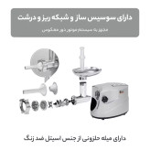 دو نوع شبکه برش از جنس استیل ضد زنگ وظیفه چرخ کردن گوشت را بر عهده دارند، تیغههای برش دهنده و میله حلزونی از جنس اسیتل ضد زنگ بوده و بر اثر بارها شستشو و قرار گرفتن در معرض آب دچار زنگ زدگی و تغییر کیفیت نمیشوند. طراحی زیبا در کنار کارآیی راحت از ویژگیهای جدا نشدنی این محصول هستند. در نهایت این مجموعه که جهت چرخ کردن گوشت به کار میرود با قیمت مناسب قابل خریداری است.