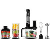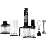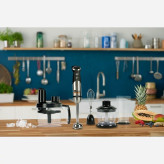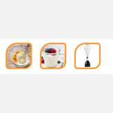 همچنین این دسته دارای دو دکمه با عملکردهای مختلف است، که یکی برای روشن کردن و دیگری برای تنظیم سرعت است. تیغههای گوشت کوب از جنس استیل ضد زنگ بوده و قدرت زیادی ( 600 وات ) در له کردن مواد غذایی دارد. این تیغه به راحتی از دسته جدا شده و قابلیت شستشوی آسان نیز دارد. میله همزن نیز در این مدل جهت تهیه کیک و هم زدن مواد مختلف به کار میرود. ظرف خرد کن با ظرفیت 0.5 لیتری و تیغههای دو پره برای خردکردن مواد مختلف استفاده میشود. یک ظرف مدرج 1250 میلیلیتری نیز برای رنده کردن مواد به همراه این گوشت همه کاره تعبیه شده است، که کارایی بیشتر گوشت کوب را به همراه داشته است.