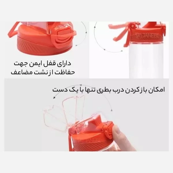 همچنین این بطری طوری طراحی شده است که نشتی آب ندارد درپوش مجهز به قفل ایمنی ویژه ای است که سفتی را افزایش می دهد. با یک حرکت رو به پایین باز می شود و با یک حرکت رو به بالا بسته می شود. طراحی قفل از باز شدن تصادفی جلوگیری می کند ، درب فنجان مانند آن شفاف و ضد گرد و غبار می باشد و آب آشامیدنی تمیز برای نوشیدن شما همیشه مهیاست. طراحی دهان گرد و لب ها احساس راحتی بیشتری به شما می دهد. بنابراین به راحتی میتوانید هنگام پیاده روی ، ورزش یا فعالیتهای بیرون از خانه و حتی در سفر از آن استفاده کنید.