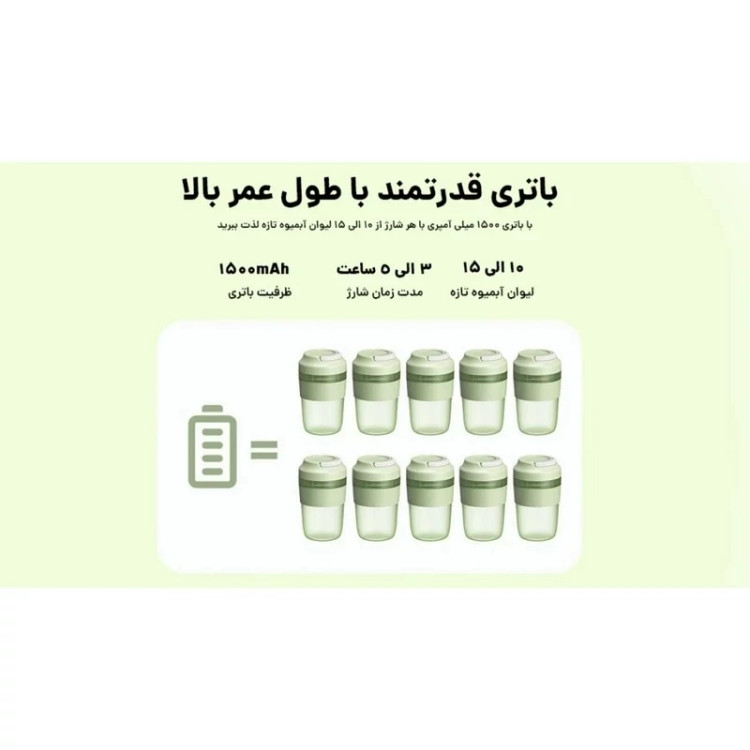 چه در خانه باشید و چه در حال حرکت، آب میوه گیری قابل حمل زوله له لذت بردن از آب میوه های تازه و مغذی را در هر زمان و هر مکای برای شما فراهم خواهد کرد؛ چرا که آبمیوه گیر قابل حمل Zolele Zi102 دارای باتری لیتیوم داخلی بوده که با عمر طولانی خود کارایی بالایی را برای کابربران رقم خواهد زد. این باتری دارای ظرفیت 1500 میلی آمپر بوده که با یک بار شارژ کامل توسط درگاه شارژ تایپ سی، امکان تهیه 10 تا 15 لیوان آب میوه را فراهم خواهد کرد. برای شارژ کامل دستگاه، 3 الی 5 ساعت زمان کافی است.