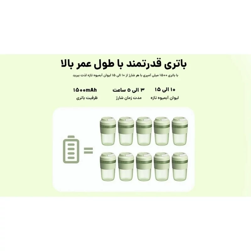چه در خانه باشید و چه در حال حرکت، آب میوه گیری قابل حمل زوله له لذت بردن از آب میوه های تازه و مغذی را در هر زمان و هر مکای برای شما فراهم خواهد کرد؛ چرا که آبمیوه گیر قابل حمل Zolele Zi102 دارای باتری لیتیوم داخلی بوده که با عمر طولانی خود کارایی بالایی را برای کابربران رقم خواهد زد. این باتری دارای ظرفیت 1500 میلی آمپر بوده که با یک بار شارژ کامل توسط درگاه شارژ تایپ سی، امکان تهیه 10 تا 15 لیوان آب میوه را فراهم خواهد کرد. برای شارژ کامل دستگاه، 3 الی 5 ساعت زمان کافی است.
