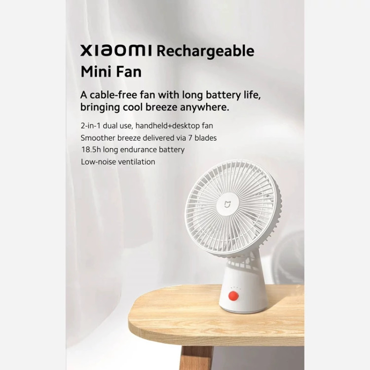 پنکه شارژی مینی شیائومی Xiaomi Rechargeable Mini Fan یک پنکه دو کاره است که می توانید به عنوان پنکه دستی یا رومیزی از آن استفاده کنید. این پنکه دارای طراحی ساده و شیک است و با رنگ سفید عرضه شده است. ابعاد این پنکه 250*87*170 میلی متر و وزن آن 670 گرم است.