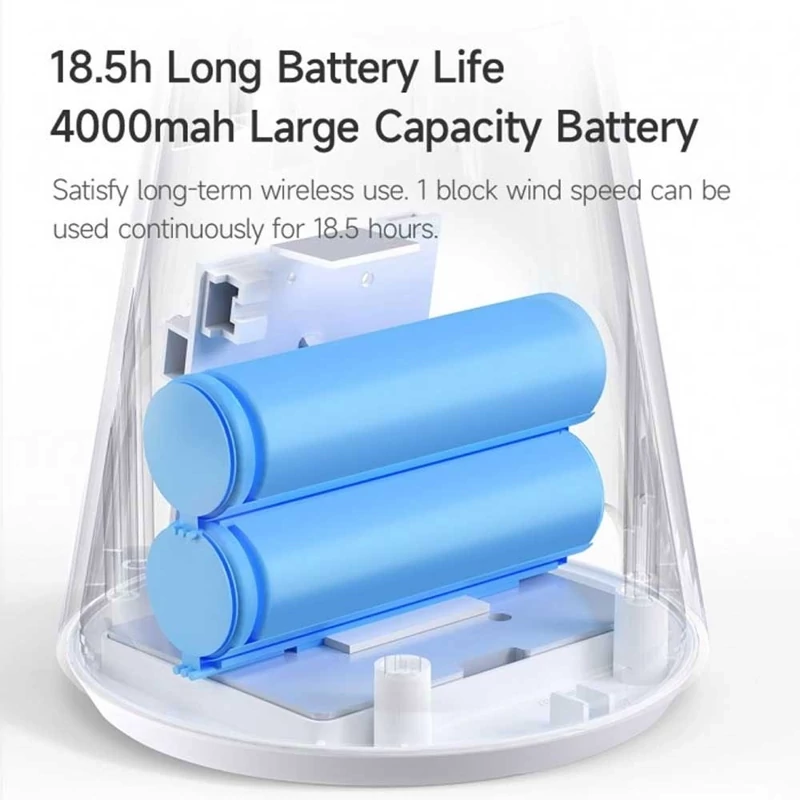 پنکه شارژی مینی شیائومی ZMYDFS01DM از یک باتری لیتیوم پلیمر با ظرفیت 4000 میلی آمپر ساعت استفاده می کند که با کابل تایپ سی شارژ می شود. در صورت شارژ کامل باتری، می توانید از این پنکه تا بین 3-15 ساعت به صورت بی سیم استفاده کنید. البته مدت زمان کارکرد پنکه به سطح سرعت باد و حالت چرخش آن بستگی دارد.
