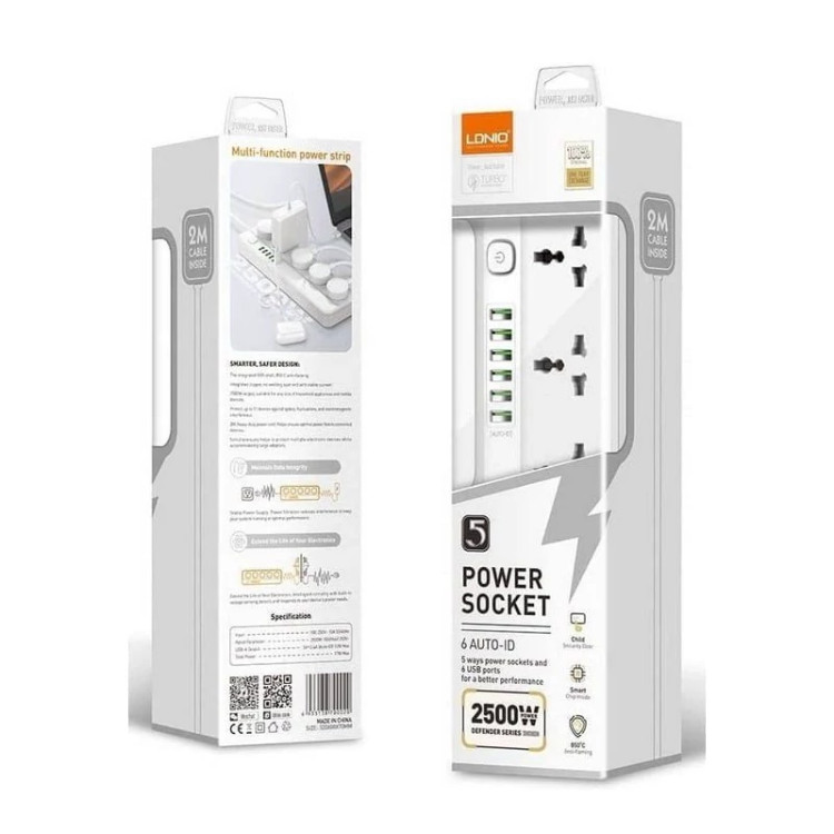 چندراهی LDNIO SC5614 از ABS و PC نسوز ساخته شده است. این چند راهی دارای 5 خروجی برق و 6 پورت شارژ USB می باشد. ابعاد چندراهی برق الدینیو 277x81x34 میلیمتر می باشد.